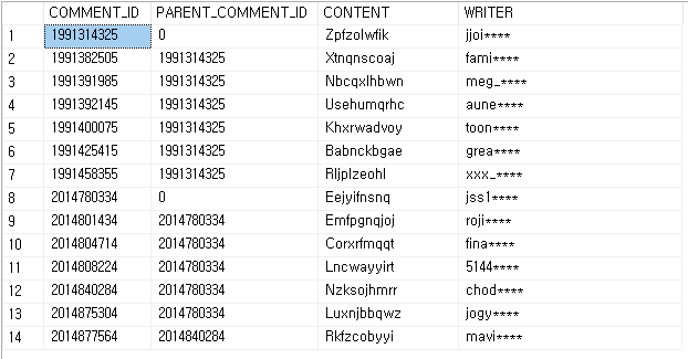 댓글은 PARENT_COMMENT_ID 의 데이터 값이 0 이며, 이를 NULL 로 해도 상관은 없습니다. NULL 사용시 아래 구분의 WHERE 조건에서 IS NULL 로 교체 하시면 되겠습니다. 대댓글(댓글의 댓글)은 상위 댓글의 COMMENT_ID 값을 저장하게 되는 구조입니다.