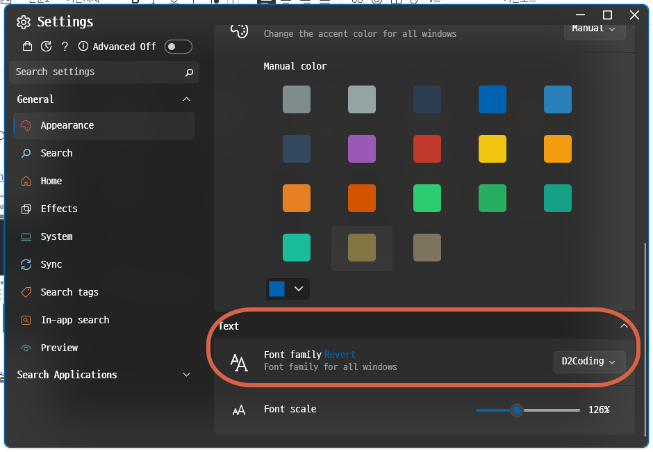 D2coding 설치 하고 나서 환경설정(톱니바퀴 아이콘) > General > Appearance 에 Text 의 font family 를 설치한 D2coding 폰트 선택하시면 됩니다.