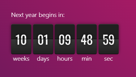 Display the possibles days offsets %n, %d and %D regarging the months, weeks and the total amount of the days until the finish date. New year's eve in months: HTML: JS: $('#wrapper').countdown('2020/10/10', function(event) { $('#clock-a').html(event.strfti