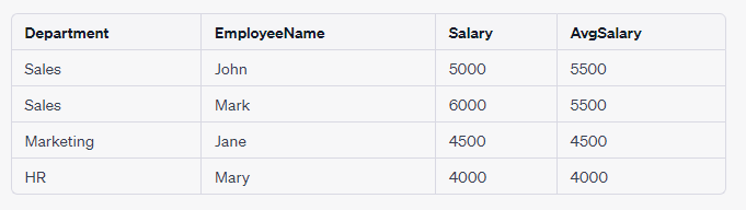 AVG(Salary) OVER (PARTITION BY Department) AS AvgSalary