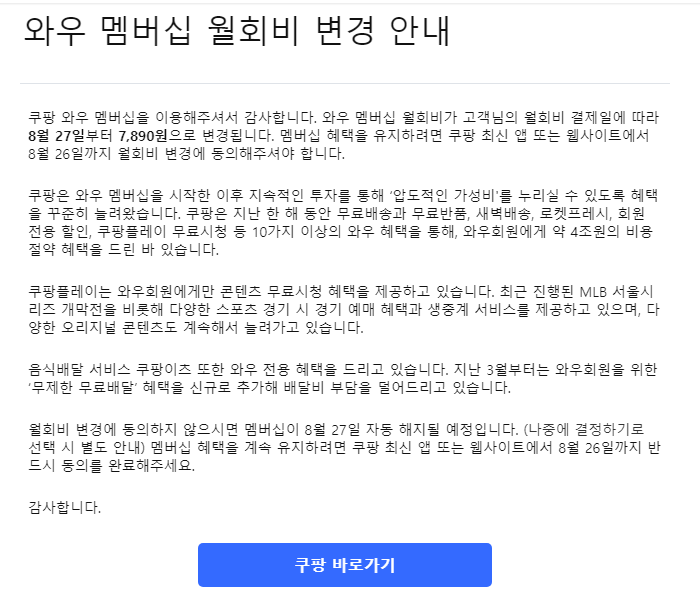 쿠팡 와우 멤버십을 이용해주셔서 감사합니다. 와우 멤버십 월회비가 고객님의 월회비 결제일에 따라 8월 27일부터 7,890원으로 변경됩니다. 멤버십 혜택을 유지하려면 쿠팡 최신 앱 또는 웹사이트에서 8월 26일까지 월회비 변경에 동의해주셔야 합니다.
