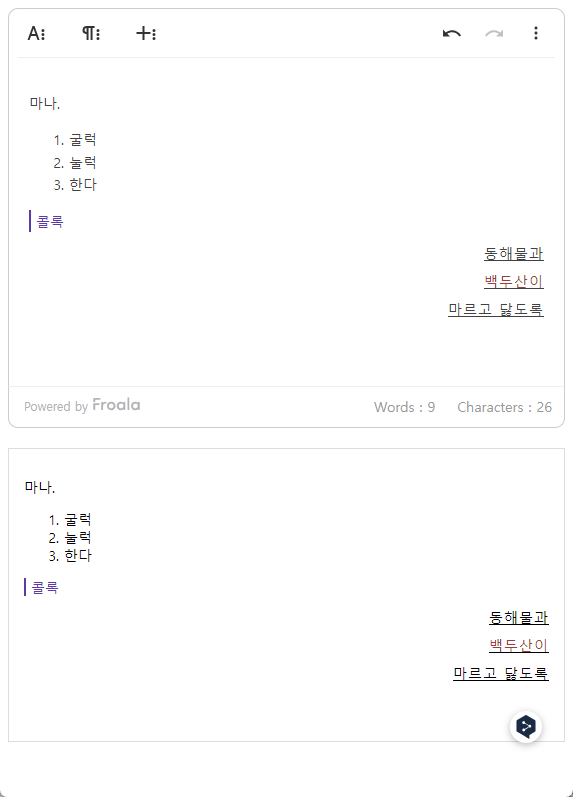 이 코드를 사용하면 Froala Editor에서 작성된 콘텐츠가 웹 페이지에서도 올바르게 표시되며, 스타일 및 레이아웃이 에디터와 일관성을 유지합니다. 이 설정은 블로그, CMS, 웹 애플리케이션 등 다양한 환경에서 사용자에게 직관적인 콘텐츠 편집 및 미리보기 기능을 제공하는 데 유용합니다.