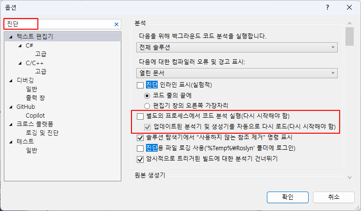 별도의 프로세스에서 코드 분석 실행 OFF 하기