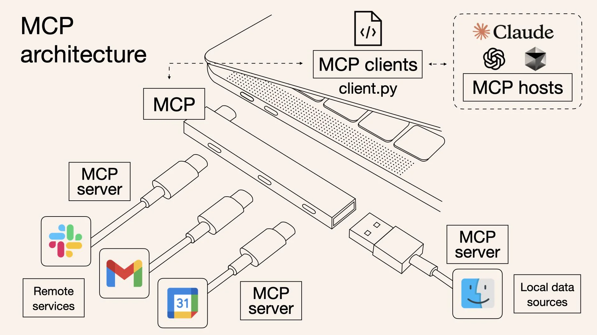 MCP를 활용하면 코딩 툴, 생산성 앱, 데이터베이스, 검색 엔진 등 다양한 서비스를 AI가 자동으로 사용할 수 있게 되며, 개발자들은 직접 MCP 서버를 구축하여 AI 환경을 확장할 수도 있다.
