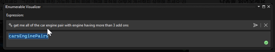 구문 강조 기능에 더해, 이제는 AI와 실시간으로 대화하면서 쿼리를 수정할 수 있습니다. IEnumerable Visualizer 내에 GitHub Copilot 인라인 채팅이 통합되었기 때문이죠.