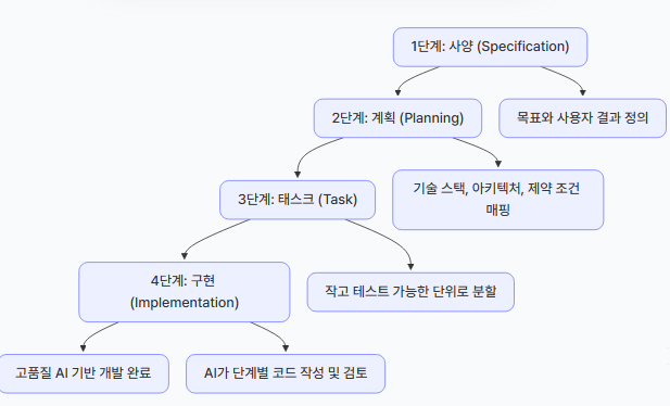 SpecKit은 AI 코딩의 정확도와 신뢰성을 높이기 위해 개발 과정을 체계적인 4단계로 나누었어요 . 이 4단계는 마치 건물을 지을 때 설계도를 만들고, 계획을 세우고, 작은 작업으로 나누어 시공하는 과정과 비슷해요. 각 단계마다 명확한 목표와 점검 지점(체크포인트)이 있답니다 .