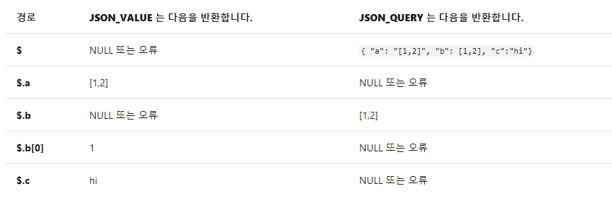 JSON_QUERY함수는 JSON 문자열에서 개체 또는 배열을 추출합니다.다음 예제는 쿼리 결과에 JSON 조각을 반환하는 방법을 보여줍니다.