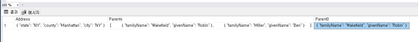 JSON_VALUE함수는 JSON 문자열에서 스칼라 값을 추출합니다.다음 쿼리는JSON 필드에서 id 를 기준으로city및stateJSON 필드를 정렬된 값 WakefieldFamily 값과 일치하는 row 값을 반환합니다.