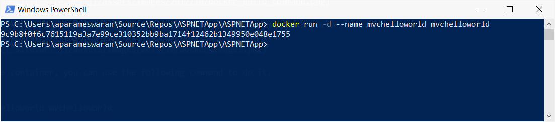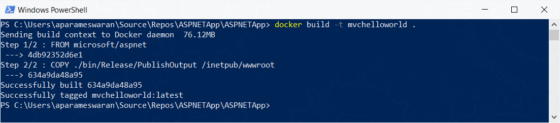 -t 인수는 이미지를 식별하는 데 도움이되는 태그 이름을 지정합니다.이미microsoft/aspnet이미지를이미 다운로드 했으므로빌드 명령이 매우 빠르게 실행되고 이미지가 빌드됩니다.처음으로하는 경우 시간이 걸릴 수 있습니다.