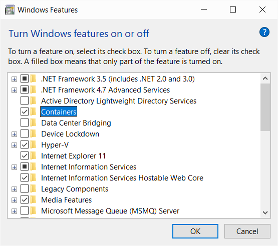 먼저 프로그램 및 기능에서 컨테이너 옵션을 활성화해야합니다.