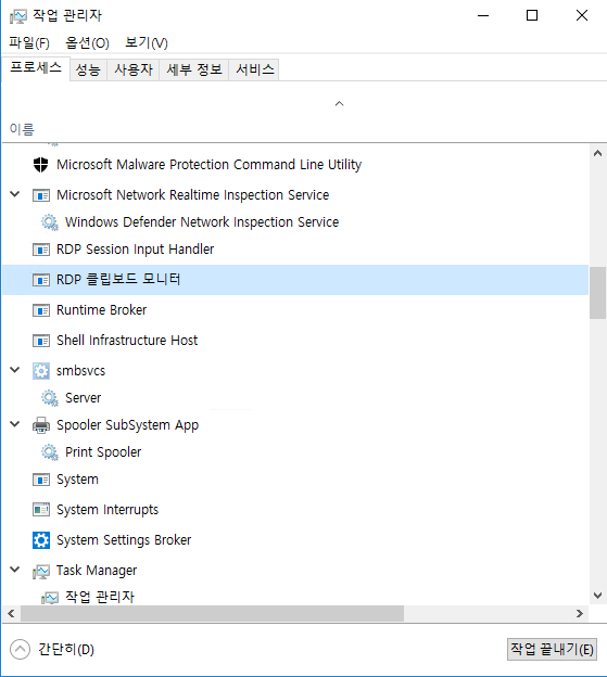 작업관리자에서 프로세스 탭에... RDP 클립보드 모니터의 프로세스를 종료합니다..