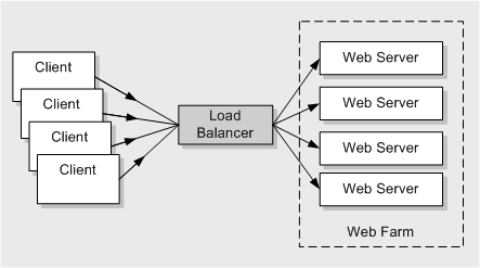 로드 밸런싱 기술 자체는 상당히 오래된 것입니다. 이름에서 알 수 있듯이, 몰려오는 트래픽을 내부적으로 분산하여 특정 서버 컴퓨터로 연결이 몰려 서비스가 사용 불가 상태로 빠지는 것을 "지연"시키거나 "완화"시키는 것에 목적이 있습니다. 로드 밸런싱의 기술적 개념도는 다음과 같습니다. (이미지 출처: http://msdn.microsoft.com/en-us/library/ff650667.aspx)