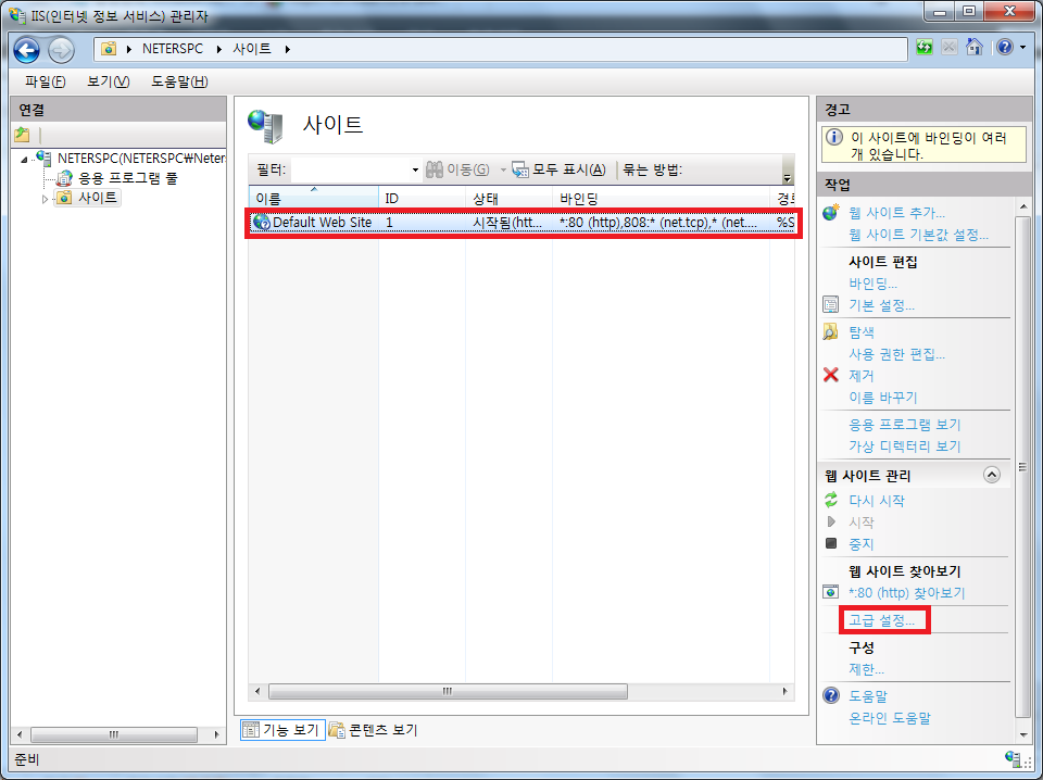 위에있는 그림에서 빨간색으로 그린 부분이 서버 컴퓨터마다 차이가 있다면 이 값을 수정해주어야 합니다. 이 값을 수정하기 위해서는 수정할 사이트를 클릭하고, 고급 설정 링크를 아래 그림과 같이 클릭합니다.