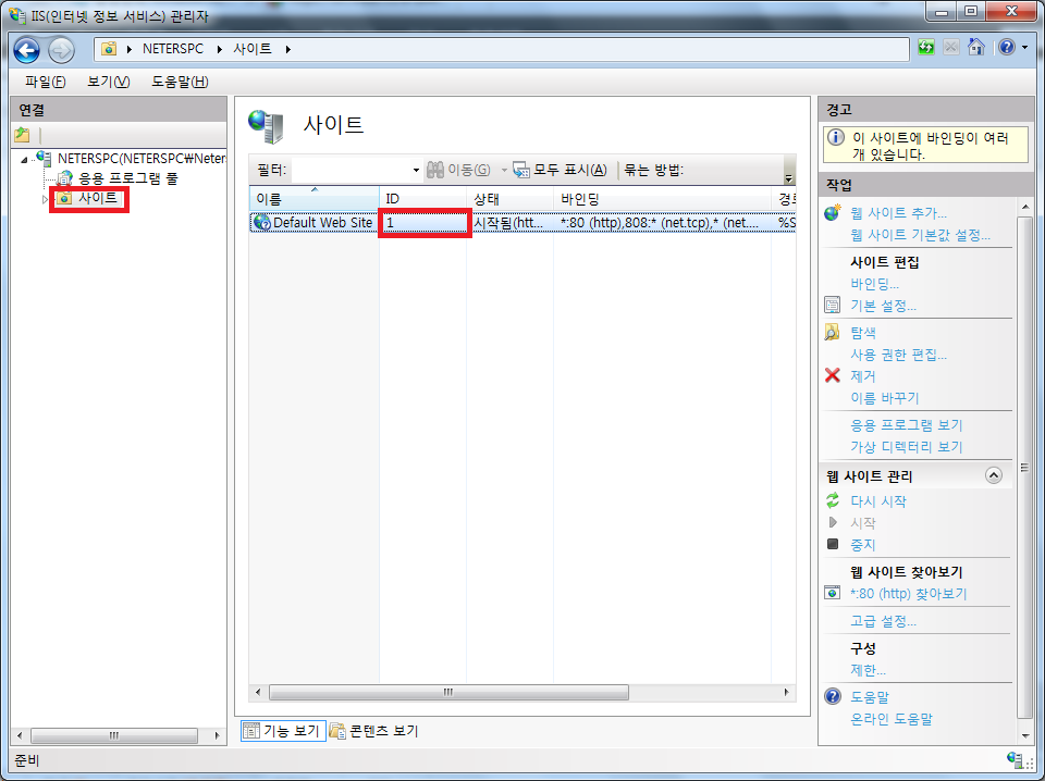 확인 버튼을 누른 다음, ID 값이 바뀐 서버 컴퓨터에 한해서 IIS 전체를 재시작해주시거나 사이트 재시작을 시켜주시면 정상적으로 작동하게 될 것입니다.