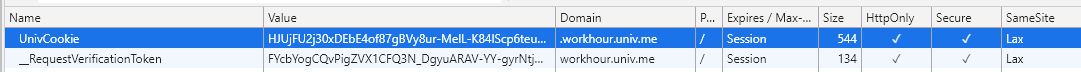 web.config 에는 단지 SameSite 에 대한 정의를 하지 않았으므로 기본값인 none 이 되어 아래와 같이 기본적으로 제공하는 _RequestVerificationToken 값이 없습니다. 단, web.config 에 cookie 설정을 httpOnlyCookies 를 true 지정해서 httpOnly 가 체크되어 있습니다.