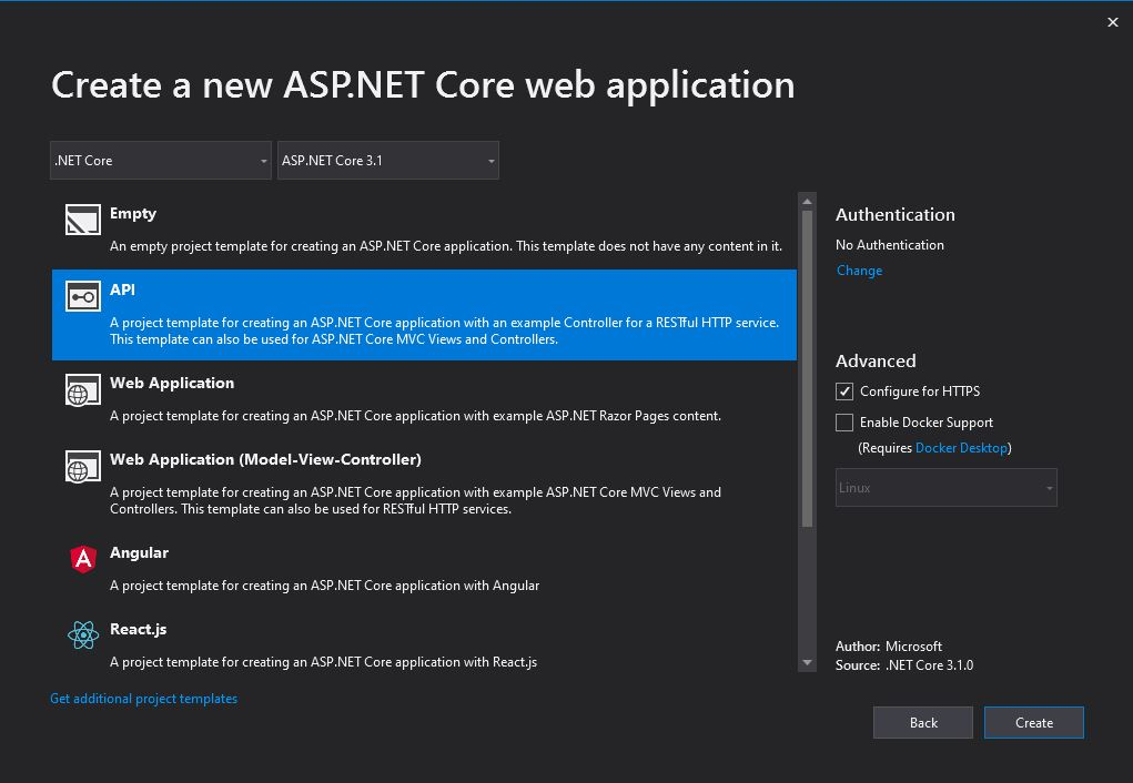 Visual Studio에서 "ASP.NET Core Web Application" 프로젝트를 만들고 이름과 경로를 선택하십시오.