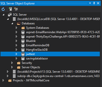 SQL 서버와 데이터베이스가 없는 경우, 마이크로 소프트 SQL Server Management Studio를 설치하고 로컬 데이터베이스를 만듭니다 . Visual Studio에서 View-> SQL Server Object Explorer를 클릭하면 아래와 같이 볼 수 있습니다.