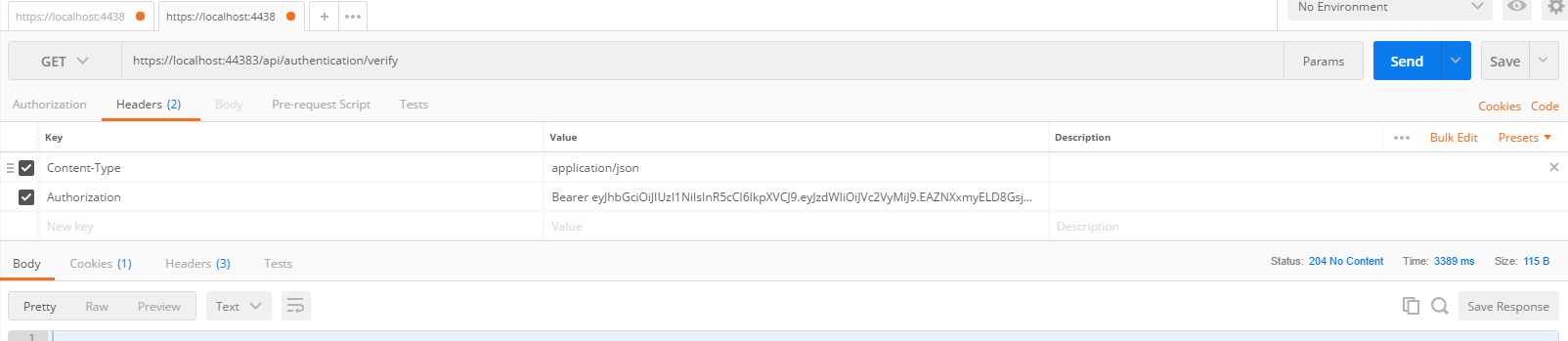 이제 "verify" endpoints를 사용하여 토큰을 테스트 해 보겠습니다. "Headers"탭에서 "Bearer <your-token>"을 "Authorization"으로 추가하십시오.