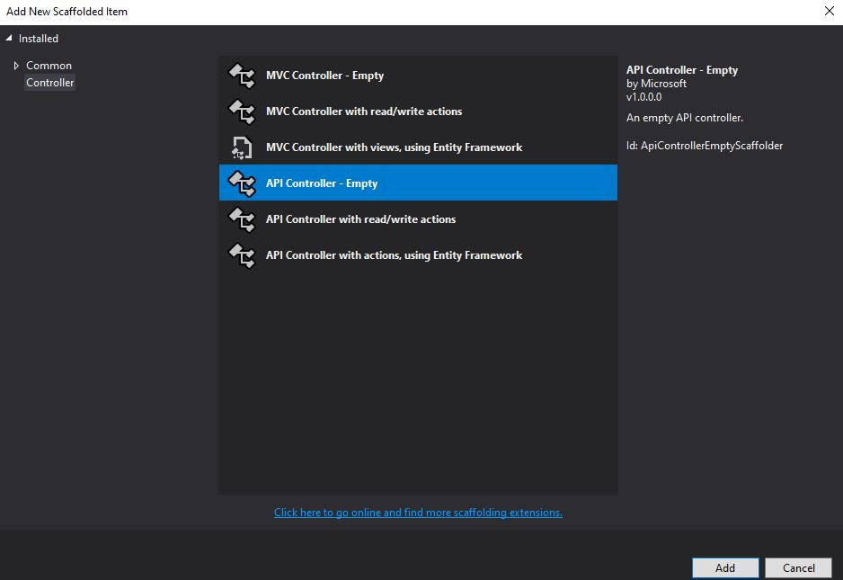With the JWT creation/verification set up, the final step is to create the endpoints that will be called by the API Gateway. In the “Controllers” folder, create a new controller called “AuthenticationController” — choose the “API Controller — Empty” option: