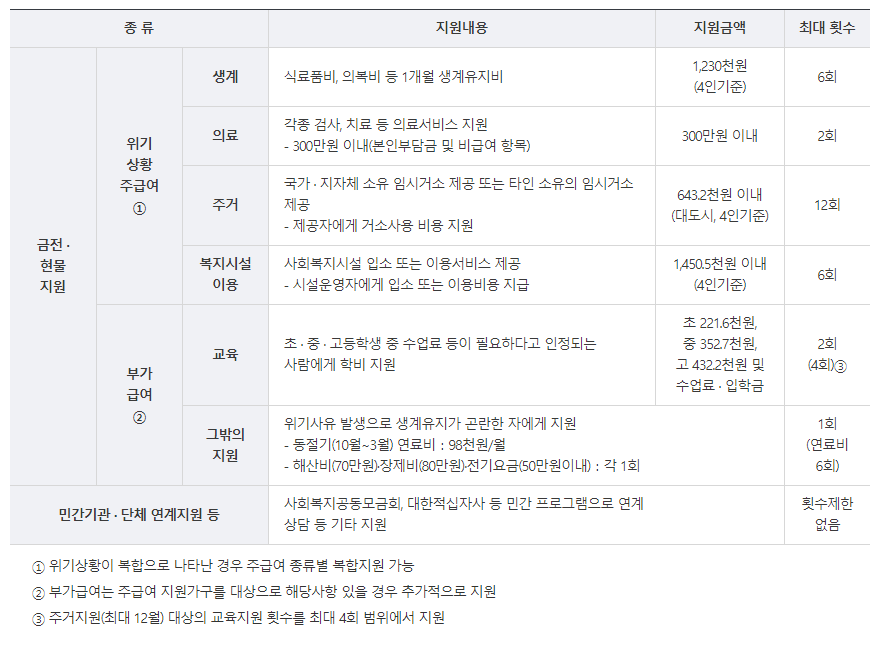 갑작스러운 위기상황으로 생계유지가 곤란한 저소득층에게 생계 · 의료 · 주거지원 등 필요한 복지서비스를 신속하게 지원하여 위기상황에서 벗어날 수 있도록 돕는 제도 입니다.