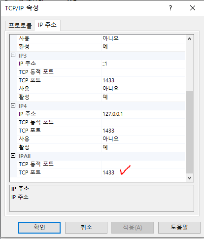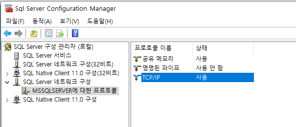 SQL Server configuartion Manager 에서 네트워크 구성 중에 프로토콜의 tcp/ip 를 "사용" 으로 선택하고, 속성에서 1433 포트를 지정합니다.