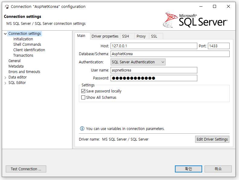 설치된 dbeaver 를 가동하여 mssql 제품 군을 선택하고, 내부의 mssql 접속하고자 한다면 host 에 127.0.0.1 및 port 는 1433 그리고 database 및 아이디, 패스워드를 통해 인증한 다음, 접속이 가능한지 Test Connection... 을 선택할 경우 오류 메시지 없으면 연결이 성공한 것입니다.
