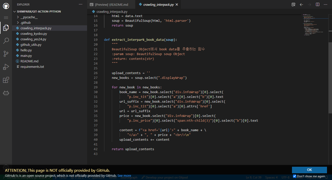 여기서 https://www.github1s.com/shimpark/git-action-python 처럼 github 뒤에 1s 를 붙여서 접속하면 아래와 같은 vscode 와 동일한 UI 를 같은 뷰어를 제공합니다. 당연히 뷰어이므로 추가 및 수정은 불가합니다.