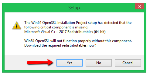 다운로드 받은 OpenSSL 설치 프로그램을 실행합니다.OpenSSL을 사용하려면 시스템에 Microsoft Visual C++ 를 설치해야 합니다.시스템에 Microsoft Visual C++가 설치되어 있지 않은 경우 설치 프로그램은 다음과 같은 메시지를 알려줍니다.