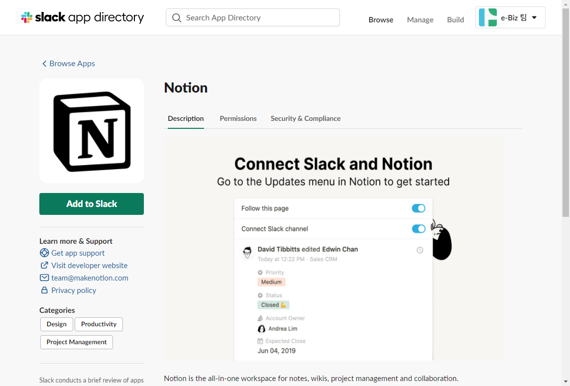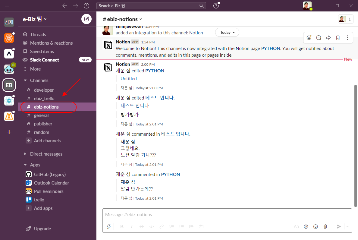 저는 채널 목록에서 ebiz-notions 방을 선택했습니다.