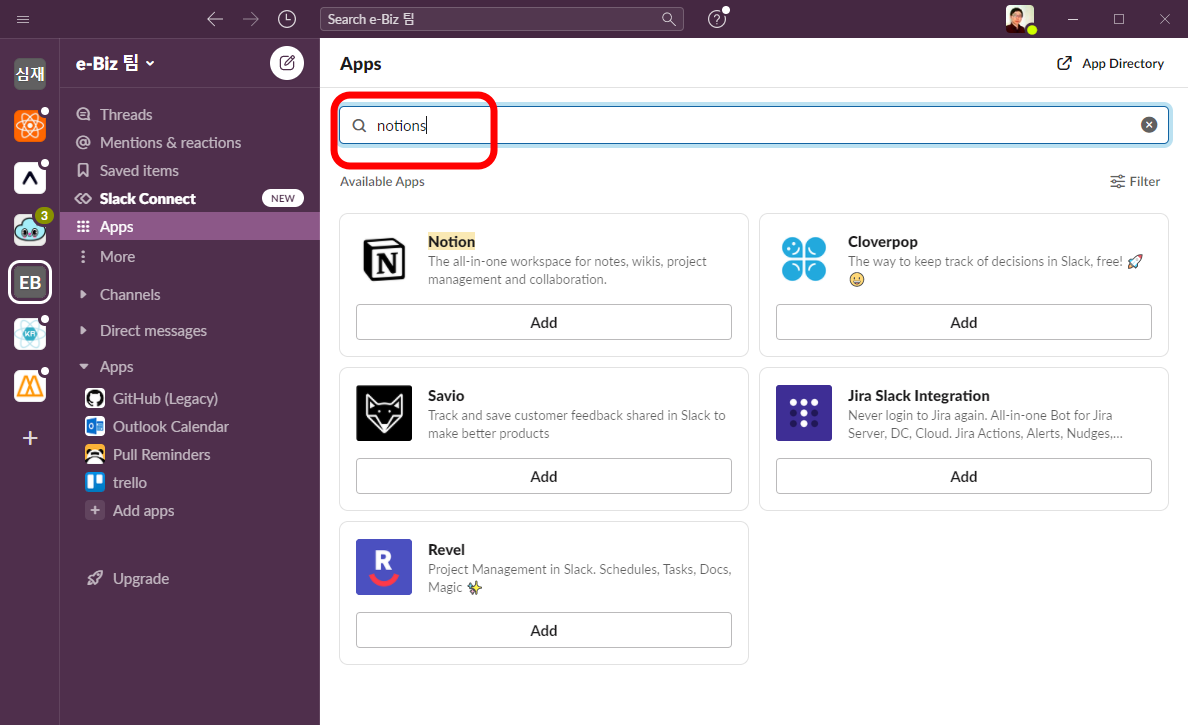 검색 기능에서 notion 라고 입력하면 아래 목록 중에 Notion 이 보이며 "add" 버튼을 선택합니다.