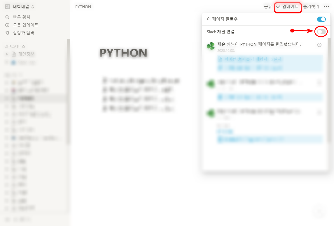 Slack 으로 알람 받을 페이지를 선택합니다. 저는 PYTHON 이라는 개인 페이지를 선택하고 나서 우측 상단에 보이는 "업데이트" 버튼을 선택했습니다.