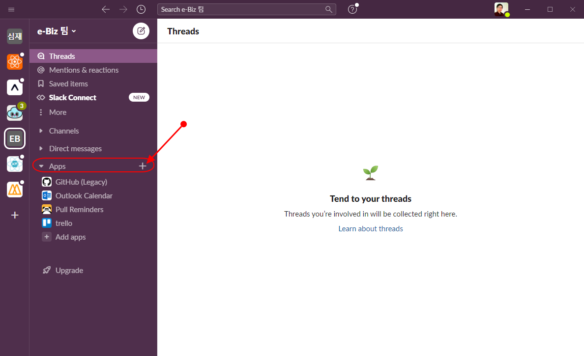 slack 을 사용하시고 계신다면, 노션에서 알람 받을 workspace 안에 들어가서, 아래와 같이 Apps 우측에 있는 + 버튼을 선택합니다.