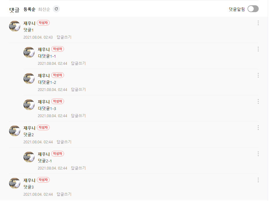 네이버 카페나 다음 카페의 댓글 형태도 트리 형태로 구축되어 있습니다. 즉, 최근에 작성한 글이 하단에 위치한 형태입니다.