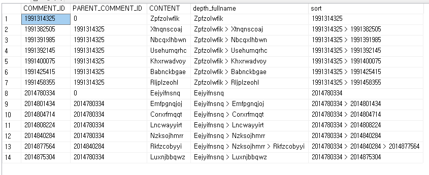 댓글은 PARENT_COMMENT_ID 의 데이터 값이 0 이며, 이를 NULL 로 해도 상관은 없습니다. NULL 사용시 아래 구분의 WHERE 조건에서 IS NULL 로 교체 하시면 되겠습니다. 대댓글(댓글의 댓글)은 상위 댓글의 COMMENT_ID 값을 저장하게 되는 구조입니다.