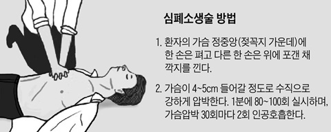 현재 국제심폐소생술위원회 가이드라인에 따른 심폐소생술 방법은 가슴의 정중앙(두 젖꼭지의 중간 부분)을 압박하는 것이며, 아래 손은 펴고, 위의 손은 깍지를 껴 가슴이 4~5㎝정도 들어가도록 세게 압박 그리고 1분당 80~100회의 속도로 압박하며, 30회 압박에 2회 숨을 불어넣으면 된다고 합니다.