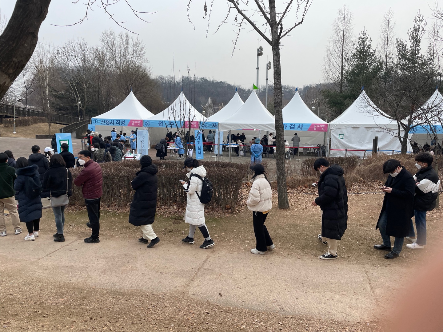 평일 및 주말 상관없이 운영해서 2022년 2월 13일, 주말 일요일에 "동작주차공원" 코로나19 검사소 운영에 방문하였습니다. 정말 많은 분들이 줄을 길게 서서 자가 검사를 하러 주말 일요일 많이 오셨습니다. 길게 2~3줄 정도 되더군요.
