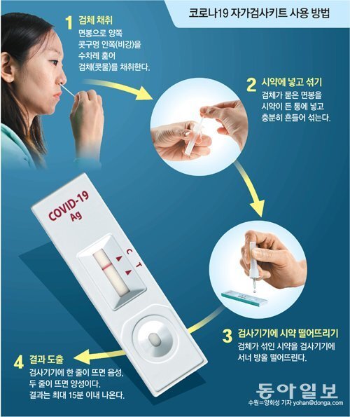 검체를 채취할 때는 검체추출액통을 꺼내서 덮개를 제거한 후 박스나 플라스틱 틀에 꽂아둬야 한다. 면봉을 뜯고 양쪽 콧구멍 1.5~2cm 깊이에 같은 면봉으로 콧속 벽에 닿은 채 각각 10회 원을 그리며 문질러야 한다. 이때 면봉의 솜 부분에 손이 닿지 않도록 주의해야 한다.