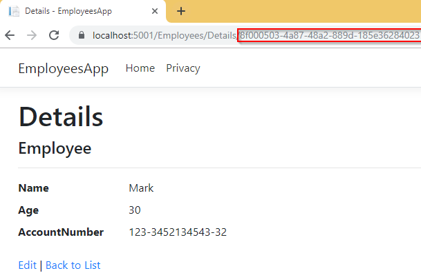 guid 의 id 값을 foreach 구문을 통해 반복하여 id 값을 Protect() 함수를 통해 암호화 하여 새롭게 만든 속성인 EncryptedId 에 암호 값을 할당합니다.