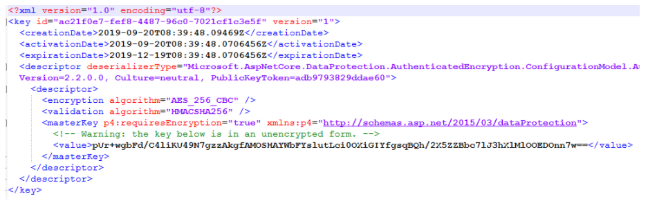 asp.net core 에서 startup 클래스에 이를 등록할 수 있습니다. 여기서 PersistKeysToFileSystem 메소드를 사용할 수 있는데요. 이를 실행하면 해당 폴더에 xml 형태의 파이링 존재합니다.