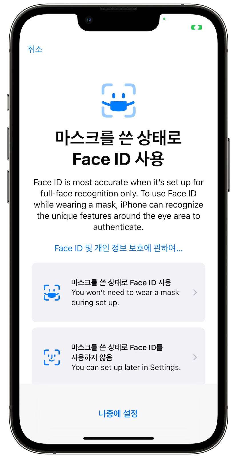 업데이트 후에, 아래 처럼 마스크를 쓴 상태로 Face ID 를 사용할 수 있게 가이드를 제공해 줍니다.