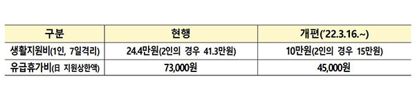 격리 기간과 관계 없이 가구당 10만 원을 정액 지원하고, 한 가구 내에서 2인 이상이 격리할 경우에는 50%를 가산해 15만 원을 지원하게 됩니다. 정부는 격리 근로자에 유급휴가를 준 사업주에게 부여해온 유급휴가 지원금 1일 상한액은 7만3천 원에서 4만5천 원으로 인하했습니다. 개편된 생활지원비와 유급휴가 비용 지원기준은 모레(16일) 입원 및 격리 통지를 받은 격리자부터 적용될 예정입니다.