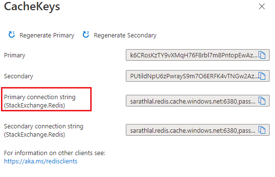그러면 팝업 창이 열리고 다양한 캐시 키가 표시됩니다. 기본 연결 문자열을 선택할 수 있습니다.