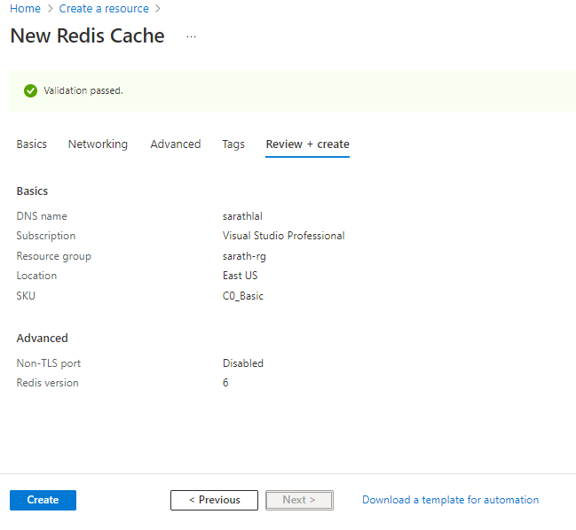 새 리소스 그룹을 생성하거나 기존 리소스 그룹을 선택하고 Redis 인스턴스에 유효한 이름을 지정할 수 있습니다. Redis 캐시에는 다양한 요금제가 있습니다. 테스트 목적으로 기본 플랜을 선택했습니다.