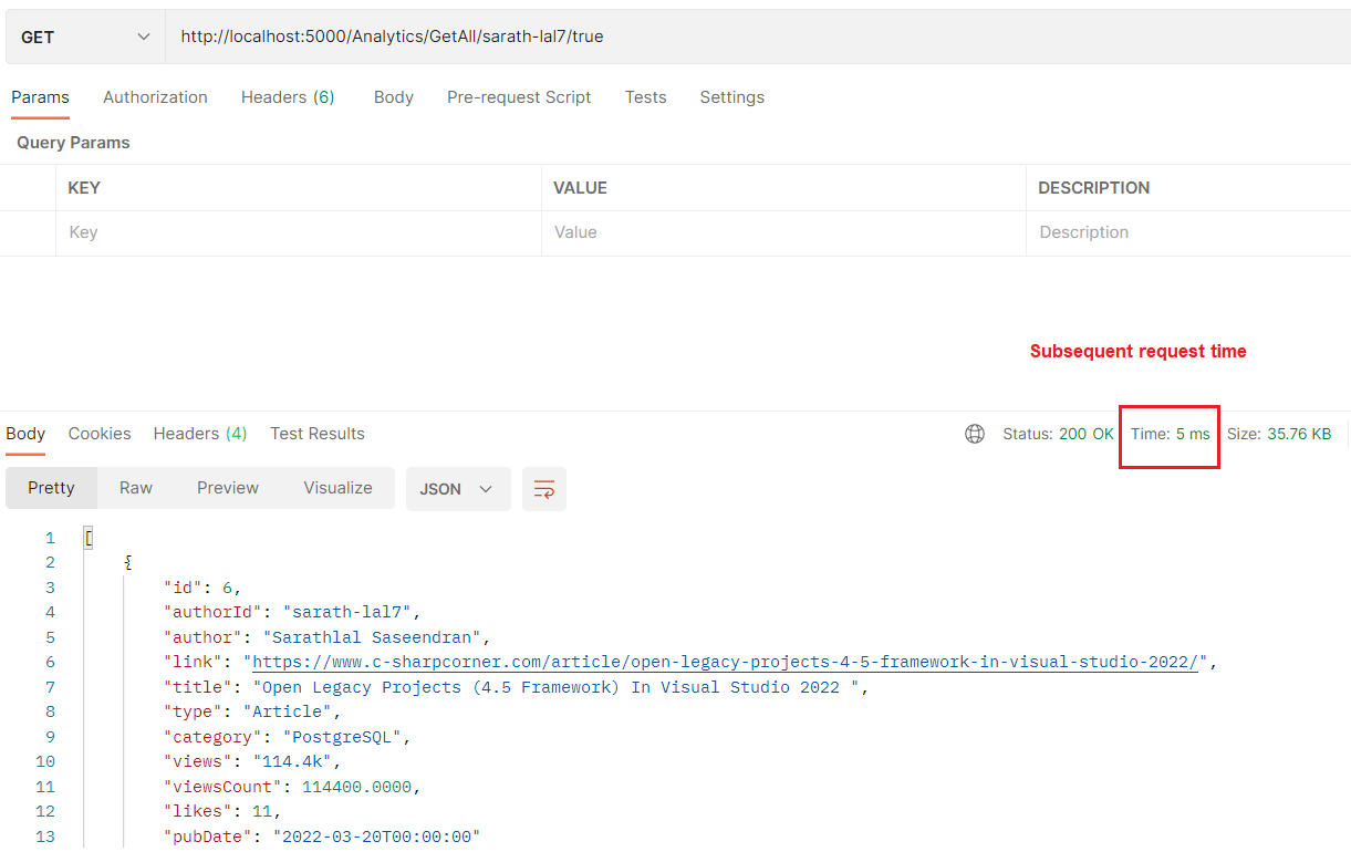상당한 성능 향상이 있음을 알 수 있습니다. 불과 5밀리초밖에 걸리지 않았습니다. 데이터베이스 대신 Redis 캐시에서 데이터를 가져오기 때문입니다.