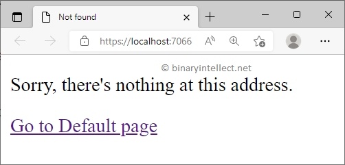 여기서는 기본적으로 Blazor의 router 를 설정합니다. router 가 URL을 찾을 수 없으면 오류 메시지가 표시되고 사용자가 Default.html 페이지로 이동할 수 있습니다(이 예제의 앞부분에서 MVC를 구성하는 동안 Default.html 페이지를 추가했습니다).