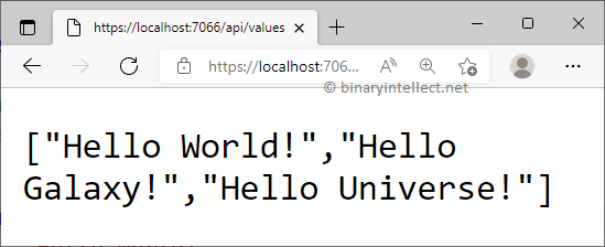 애플리케이션을 실행하고 /api/Values로 이동하여 Get() 작업을 호출합니다. 출력은 다음과 같습니다