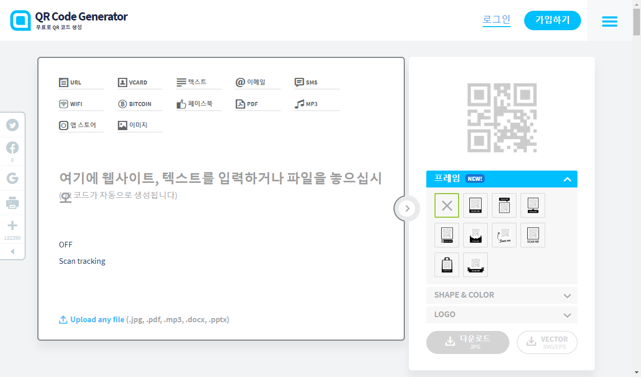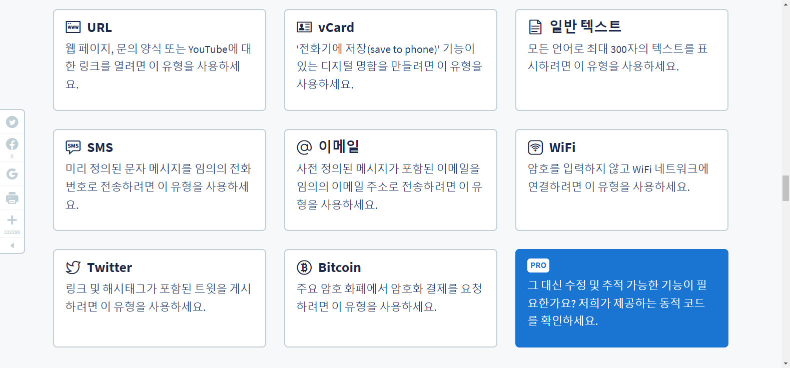 모든 정적 QR 코드는 무료입니다. 여기에는 URL, vCard, 일반 텍스트, 이메일, SMS, Twitter, WiFi 및 Bitcoin이 포함됩니다. 한 번 만든 QR 코드는 영원히 사용자 여러분의 것이 됩니다. 이러한 유형의 유일한 단점은 콘텐츠를 수정할 수 없다는 것이므로 인쇄하기 전에 항상 QR 코드를 테스트하고 작동이 되는지 확인하세요.