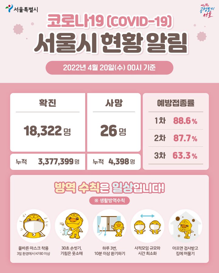 “#코로나19 서울시 현황(4.20. 00시 기준) ✔서울시 신규 확진: 18,322명(전일대비 3,497명⬇️) ✔국내 신규 확진: 111,319명(전일대비 7,185명⬇️) 🔎서울시 코로나19 통합 사이트: https://t.co/DZIZ4LRlqa”