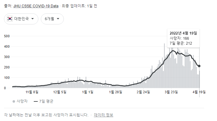 사망자 수는 2022년 3월달 부터 현재 4월까지 일별로 최대 323명에서 212명까지 꾸준히 내려가고 있는 추세 입니다.