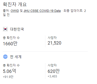 금일 코로나바이러스 감염증(COVID-19) 로 인해 사망자는 대한민국 경우 2022.04.21 검색 기준으로 누적 21,520 으로 확인이 되고 있습니다.